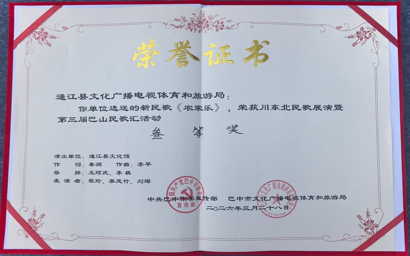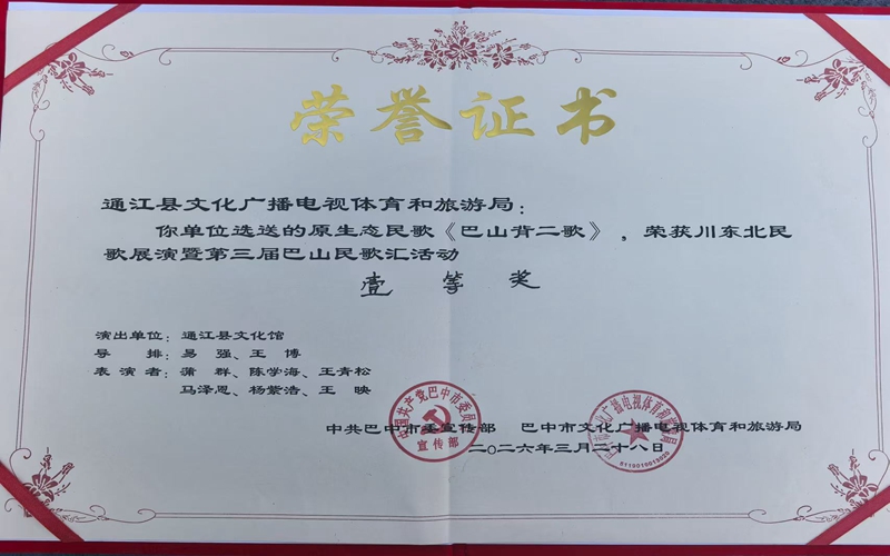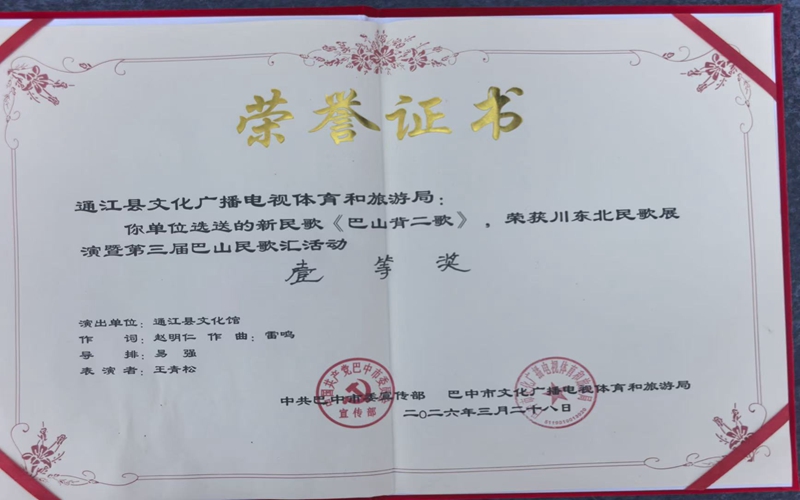 原生态《巴山背二歌》高亢质朴,生动还原川东北劳动人民的生产生活图景,饱含浓郁民俗情感,收获现场观众与线上网友一致好评;新民歌《农家乐》紧扣时代脉搏,勾勒出新时代乡村幸福生活的美好画卷。经专业评审、角逐,原生态民歌《巴山背二歌》、新民歌《巴山背二歌》分别斩获原生态、新民歌类一等奖,原生态民歌《小冤家》、新民歌《农家乐》获三等奖,通江县文广体旅局获“组织奖”,尽显通江民歌传承与创新的扎实成果。