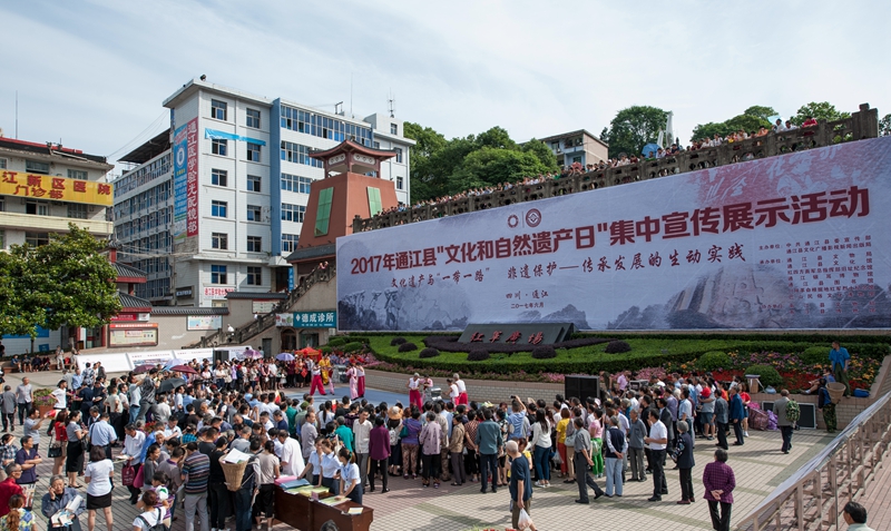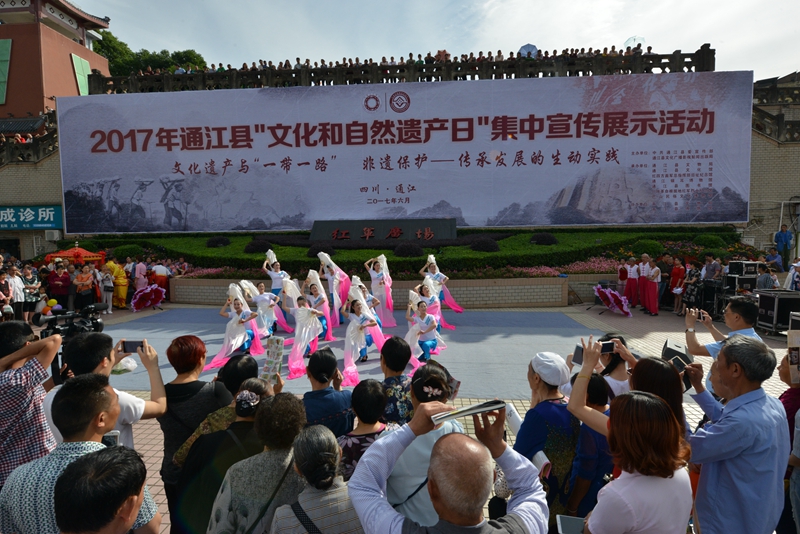 为了有效的展示宣传非物质文化遗产相关知识,通江县文化馆文化干部在馆长潘大聪的领导下,于2017年6月6日在通江县诺江镇红军广场,组织开展了“中国文化和自然遗产日”集中宣传展示活动。此次活动包括10个文艺演出节目、8张展板图片展示、《非遗法》《非遗条例》等宣传册发放、非遗进校园等活动,活动宣传方式多样,有利于各种年龄段,各种人群对非物质文化知识的学习和了解,获得了显著的宣传效果,取得了社会各界的一致好评。